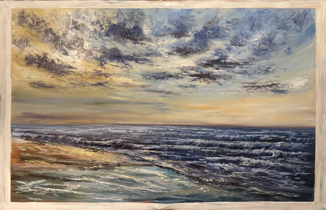 We proudly present “The Sea,” a magnificent original oil painting on canvas (90 x 140 cm), completed in 2024. This expansive landscape captures the serene, calming beauty of the ocean, showcasing the enduring skill of a master artist with four decades of professional excellence.